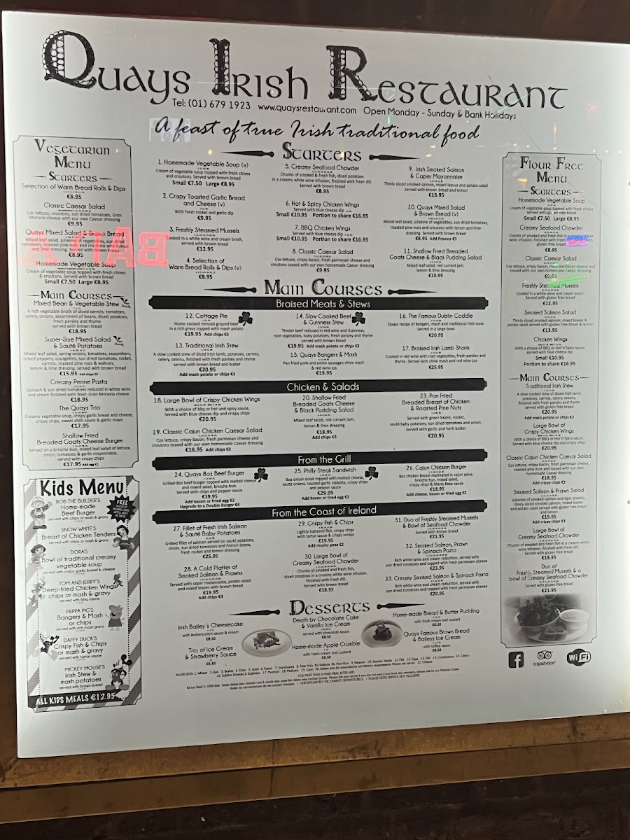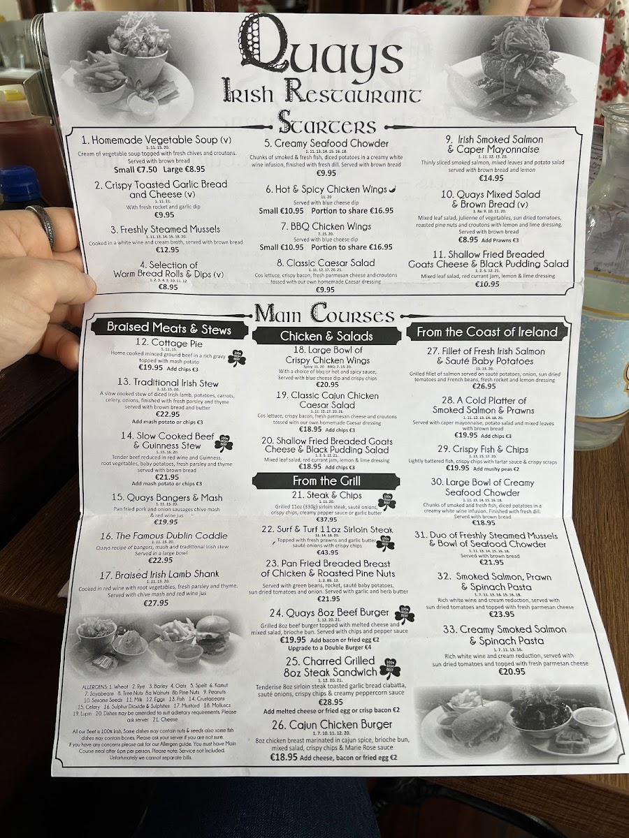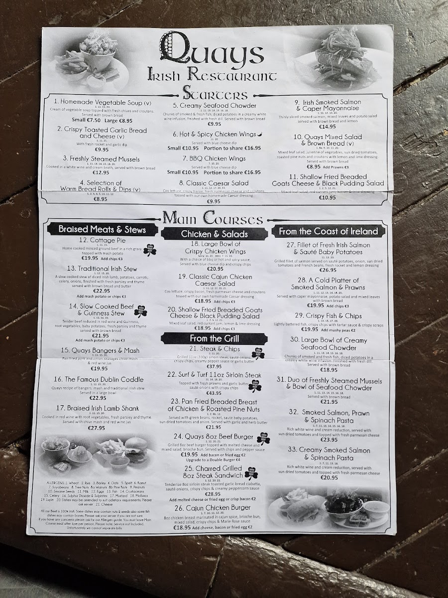 As you step inside, you are greeted with a lively atmosphere that perfectly embodies the spirit of Dublin. The Quays boasts both a lively downstairs bar, known for its live music and vivacious crowd, and an intimate dining room upstairs, where traditional Irish cuisine takes center stage. With a menu that spans local delicacies and time-honored favorites, visitors are treated to hefty portions that promise satisfaction.