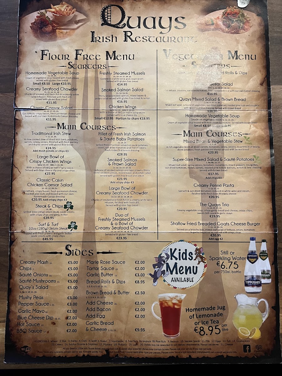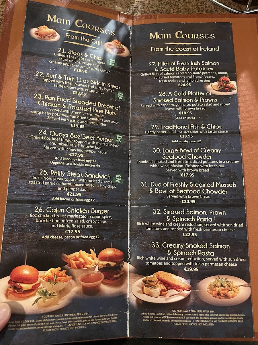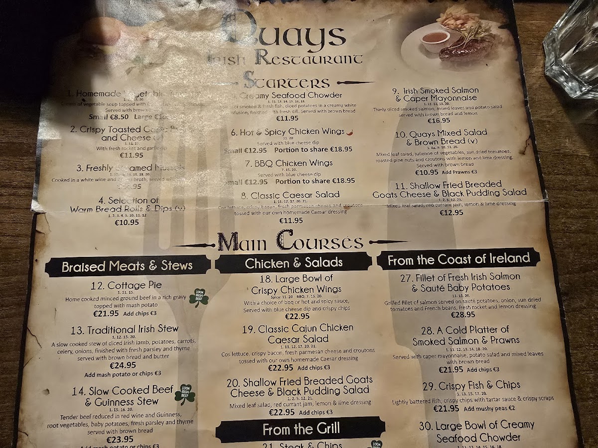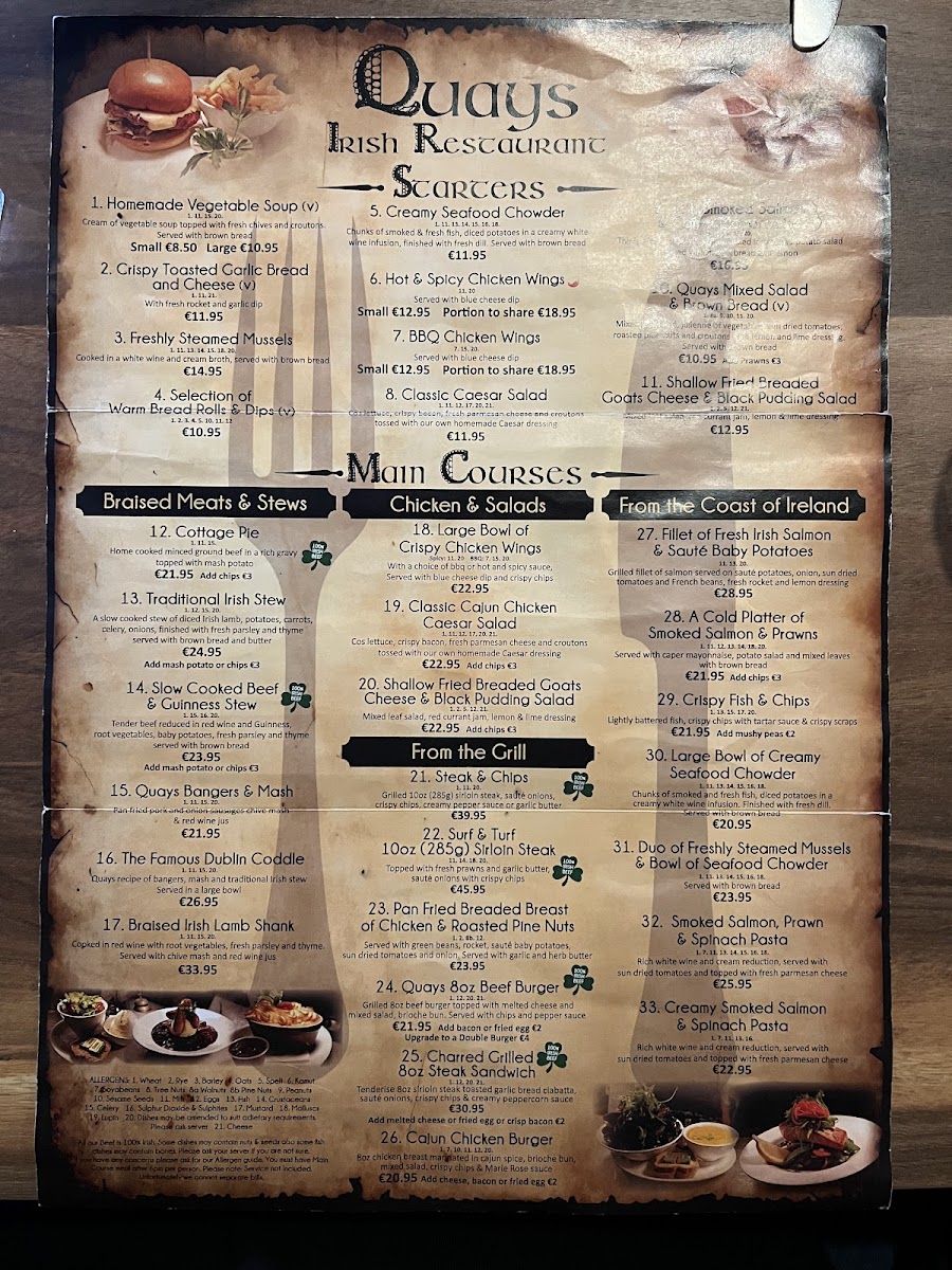 As you step inside, you are greeted with a lively atmosphere that perfectly embodies the spirit of Dublin. The Quays boasts both a lively downstairs bar, known for its live music and vivacious crowd, and an intimate dining room upstairs, where traditional Irish cuisine takes center stage. With a menu that spans local delicacies and time-honored favorites, visitors are treated to hefty portions that promise satisfaction.