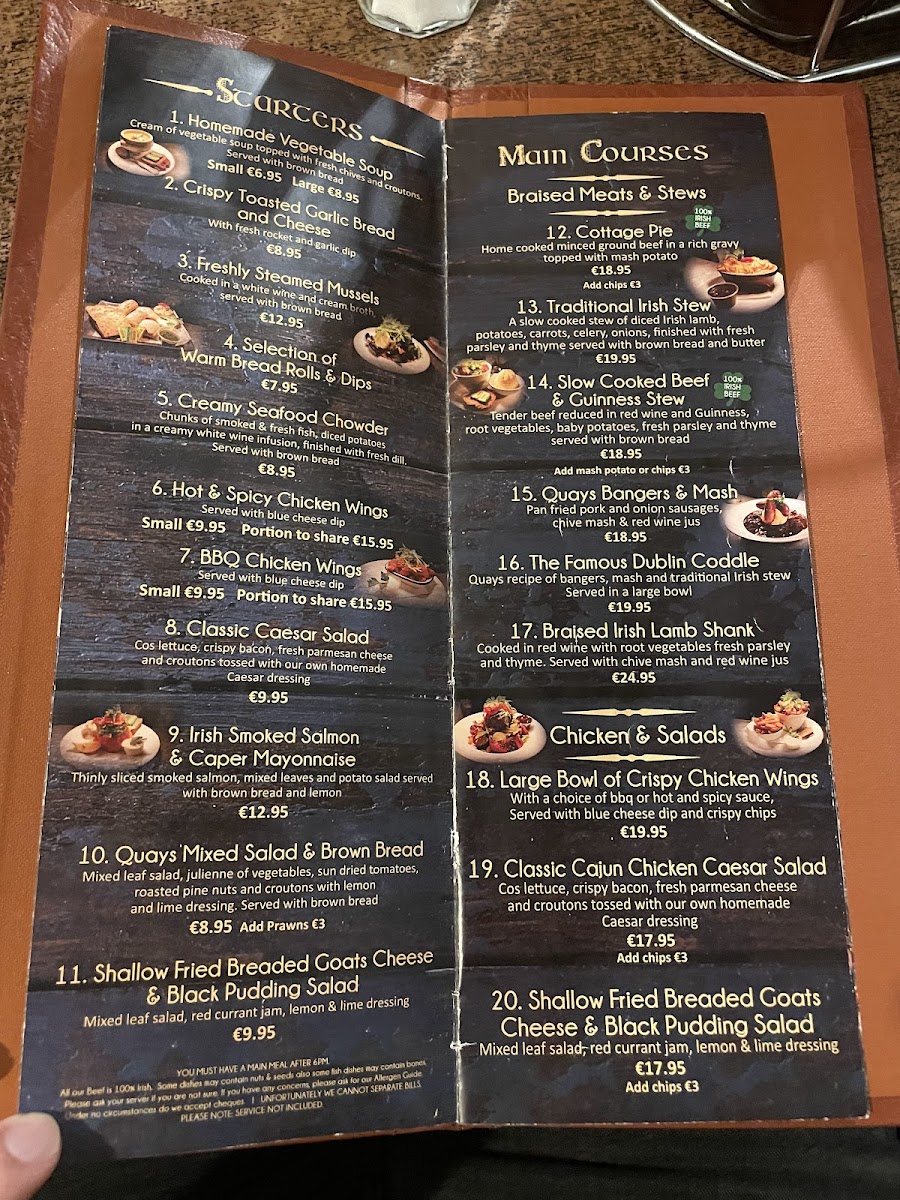 “ The Quays are by far our favorite Irish restaurant in Dublin Temple Bar area. The portion is generous for the price you pay for the food. We came mid-week before 5pm and they have special €29 for starter plus entree. We got the chowder with fish & chips, chowder with Banger mash for the special price, and also ordered their famous lamb shank. Their seafood chowder is flavorful and ery tasty, unlike the chowder in US that is full of white heavy cream. Fish & chips are large and the batter is crusty and crispy, not heavily breaded like other restaurants. The lamb shank melts in your mouth and the gravy is very flavorful, goes well with the mashed potato. This is definitely a must visit restaurant in Dublin as soon as you get here and we love The Quays better than the other popular Irish restaurant that is just a few doors down and more expensive but still feel hungry after eating. The decor for the Quays restaurant is very cool, and you can really feel they have been around. All the staff are very friendly and attentive, frequently checks on us throughout our meal. We were so full after our meal and we didn't get to try their desserts which looked so delicious. We will definitely try it when we visit again ”